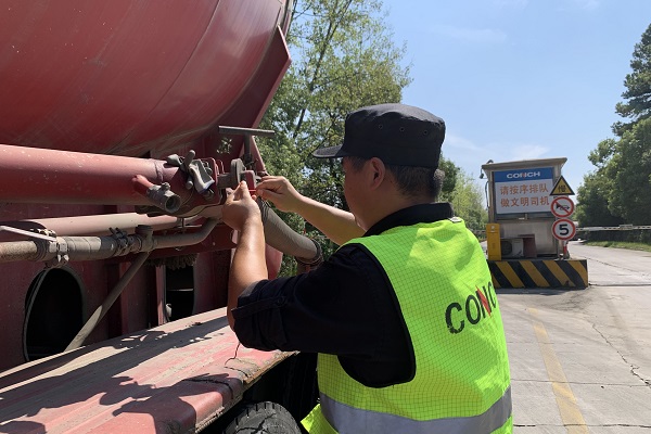 日光正盛,宣城海螺一號門外,保衛(wèi)人員陳程正在對散裝水泥出廠車輛進行鉛封,站好崗、守好責(zé),他們是夏天的“炎值”和“門面”擔(dān)當(dāng)。(謝能/攝)