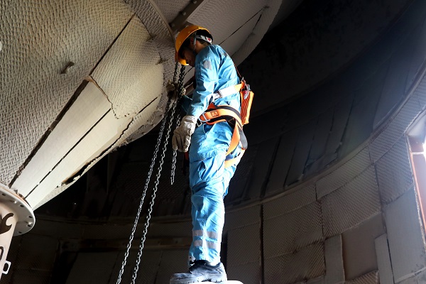 三線預(yù)熱器密尾煙室不斷往外噴涌著滾滾熱浪,身著高溫防護服的巡檢員譚平,正在對煙室內(nèi)的結(jié)皮進行清理,保障回轉(zhuǎn)窯穩(wěn)定運行。(秦建明/攝)