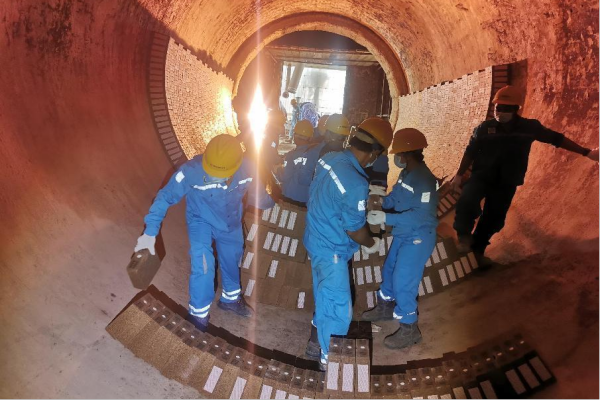 南加海螺印尼籍員工正在進(jìn)行1號窯耐火磚堆砌