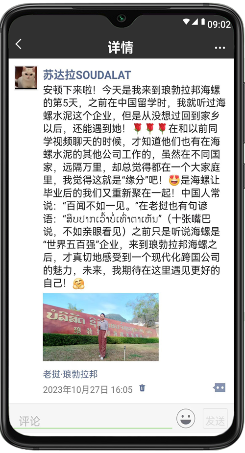 2023年是共建“一帶一路”倡議提出十周年,十年來(lái),海螺水泥堅(jiān)持人才“本地化”培養(yǎng),現(xiàn)在,海螺的大家庭里已有3000多名外籍員工,他們見證了一座座海螺工廠的拔地而起,還親身經(jīng)歷了海螺發(fā)展帶來(lái)的變化,在海螺收獲了成長(zhǎng)和友誼?,F(xiàn)在,就讓我們打開“朋友圈”,一起來(lái)看看他們的分享吧!