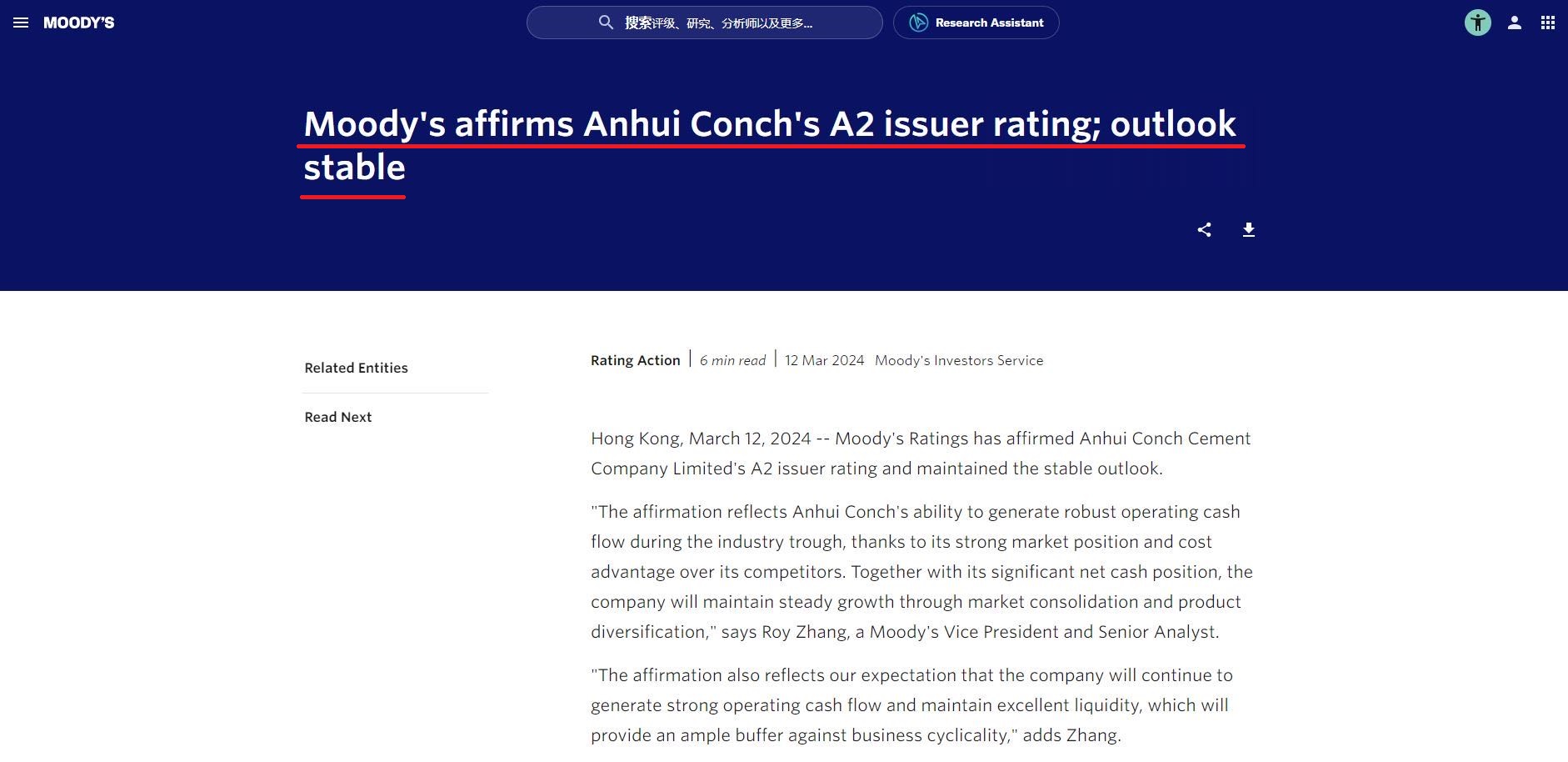 3月12日,國(guó)際金融評(píng)級(jí)機(jī)構(gòu)穆迪(Moody’s Ratings)宣布保持安徽海螺水泥股份有限公司A2發(fā)行人評(píng)級(jí),評(píng)級(jí)展望維持“穩(wěn)定”。據(jù)了解這也是全球建材行業(yè)最高評(píng)級(jí),而海螺水泥已連續(xù)七年獲此評(píng)級(jí)。