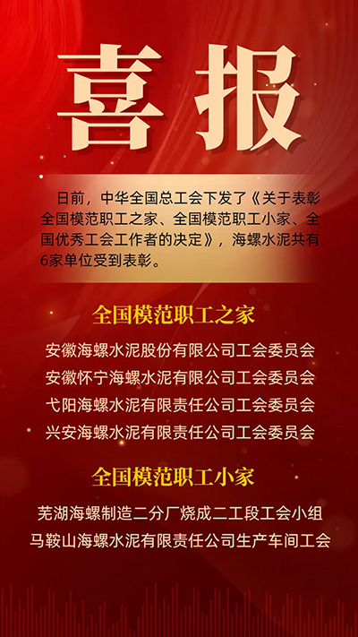 日前,中華全國總工會(huì)下發(fā)了《關(guān)于表彰全國模范職工之家、全國模范職工小家、全國優(yōu)秀工會(huì)工作者的決定》,海螺水泥共有6家單位獲得表彰。其中,安徽海螺水泥股份有限公司工會(huì)委員會(huì)、安徽懷寧海螺水泥有限公司工會(huì)委員會(huì)、弋陽海螺水泥有限責(zé)任公司工會(huì)委員會(huì)、興安海螺水泥有限責(zé)任公司工會(huì)委員會(huì)獲評(píng)“全國模范職工之家”,蕪湖海螺水泥有限公司制造二分廠燒成二工段工會(huì)小組、馬鞍山海螺水泥有限責(zé)任公司生產(chǎn)車間工會(huì)獲評(píng)“全國模范職工小家”。