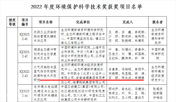 2022年12月,生態(tài)環(huán)境部公布《2022年度環(huán)境保護(hù)科學(xué)技術(shù)獎獲獎項目公告》,海螺集團(tuán)參與的《大氣污染物與溫室氣體協(xié)同控制政策和技術(shù)示范研究》榮獲2022年度環(huán)境保護(hù)科學(xué)技術(shù)獎二等獎。