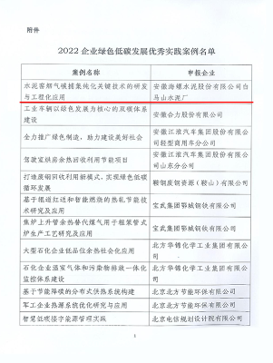 2022年12月,中國企業(yè)聯(lián)合會、中國企業(yè)家協(xié)會發(fā)布《關(guān)于發(fā)布“2022企業(yè)綠色低碳發(fā)展優(yōu)秀實踐案例”的通知》《關(guān)于入選“2022企業(yè)綠色低碳發(fā)展優(yōu)秀實踐案例”的告知函》。集團(tuán)公司牽頭組織白馬山水泥廠《水泥窯煙氣碳捕集純化關(guān)鍵技術(shù)的研發(fā)與工程化應(yīng)用》、全椒海螺《水泥生產(chǎn)全流程智能制造關(guān)鍵技術(shù)》均獲選“優(yōu)秀實踐案例”。