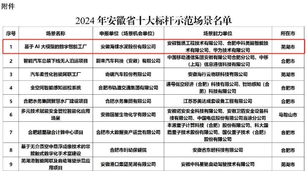 2025年6月9日,省科學(xué)技術(shù)廳發(fā)布2024年度安徽省十大標(biāo)桿示范場(chǎng)景。由海螺水泥打造的“基于 AI 大模型的數(shù)字智能工廠”場(chǎng)景入選其中。