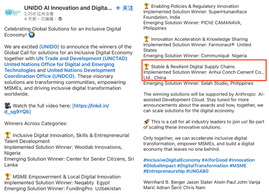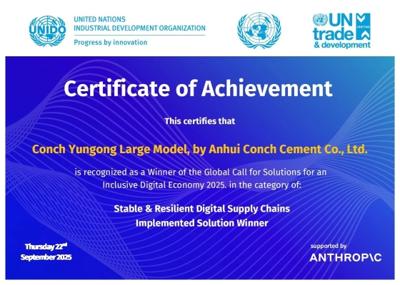 近日,海螺集團(tuán)下屬“安徽海螺水泥股份有限公司——海螺云工大模型”在聯(lián)合國(guó)工業(yè)發(fā)展組織等機(jī)構(gòu)于2025年7月發(fā)起的“2025包容性數(shù)字經(jīng)濟(jì)全球解決方案征集”中,榮獲: 穩(wěn)定與韌性的數(shù)字供應(yīng)鏈 類(lèi)別 最佳實(shí)施方案獎(jiǎng) 獎(jiǎng)項(xiàng)。