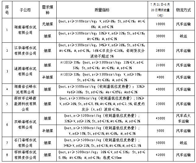 根據(jù)2021年7月21日-2021年8月20日海螺水泥湖南區(qū)域各子公司煤炭需求,現(xiàn)擬對煤炭進行公開招標,選定中標人,為體現(xiàn)公平、公正、公開的原則,拓寬采購渠道,現(xiàn)將招標相關(guān)事宜公告如下: