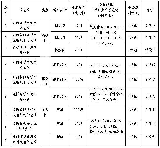 根據(jù)湖南、漣源、益陽(yáng)海螺、湖南云峰和邵陽(yáng)云峰五家公司2021年9月1日至2022年2月28日電廠廢渣(含粉煤灰、濕粉煤灰、爐渣等)的需求,現(xiàn)擬對(duì)電廠廢渣進(jìn)行招標(biāo),選定中標(biāo)人,為體現(xiàn)公平、公正、公開的原則,拓寬采購(gòu)渠道,現(xiàn)通過海螺物資陽(yáng)光采購(gòu)平臺(tái)(登陸網(wǎng)址:ygcg.conch.cn)進(jìn)行公開招標(biāo),招標(biāo)相關(guān)事宜公告如下: