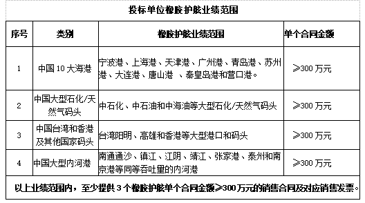 2、投標(biāo)單位需具有國內(nèi)10大港口(含下轄港口),或大型石化和天然氣碼頭,或香港和臺灣大型港口,或中國主要內(nèi)河港口的橡膠護舷銷售業(yè)績,至少提供3個以上單筆直銷合同額超過300萬元業(yè)績(其他港口、碼頭的橡膠護舷業(yè)績或非橡膠護舷產(chǎn)品業(yè)績,或單個訂單低于300萬元橡膠護舷業(yè)績不計算在內(nèi)),詳見附件1。