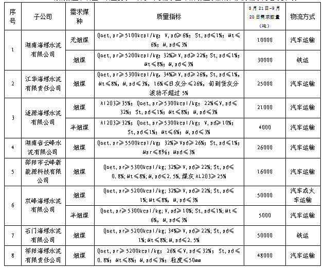 根據(jù)2021年8月21日-2021年9月20日海螺水泥湖南區(qū)域各子公司煤炭需求,現(xiàn)擬對(duì)煤炭進(jìn)行公開(kāi)招標(biāo),選定中標(biāo)人,為體現(xiàn)公平、公正、公開(kāi)的原則,拓寬采購(gòu)渠道,現(xiàn)將招標(biāo)相關(guān)事宜公告如下: