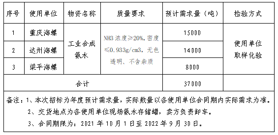 川渝區(qū)域重慶海螺、達(dá)州海螺、梁平海螺2021-2022年脫硫脫硝用氨水,具體信息如下表: