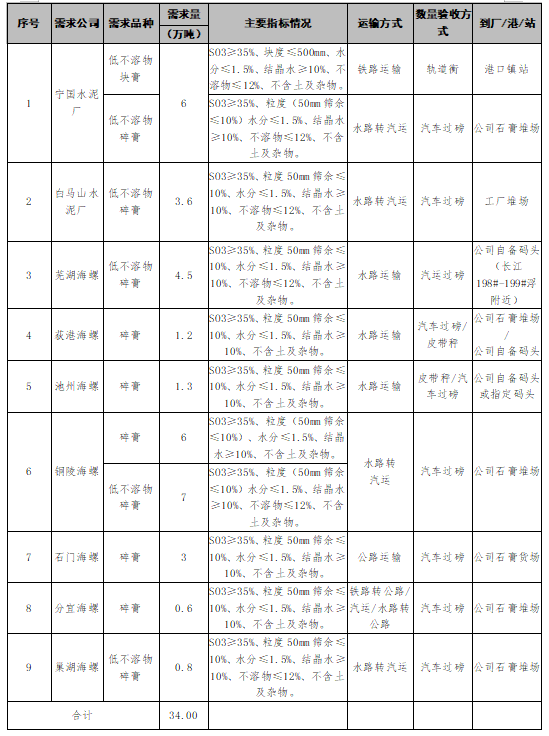 根據(jù)海螺水泥各公司生產(chǎn)經(jīng)營(yíng)計(jì)劃,安徽銅陵海螺水泥有限公司聯(lián)合華東地區(qū)部分公司對(duì)天然石膏進(jìn)行聯(lián)合招標(biāo),為進(jìn)一步體現(xiàn)公平、公正、公開(kāi)的原則,拓寬采購(gòu)渠道,提高采購(gòu)質(zhì)量,現(xiàn)將招標(biāo)采購(gòu)信息發(fā)布如下: