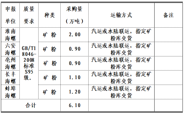 2.交貨地點:淮南海螺、六安海螺、亳州海螺、長豐海螺、蚌埠海螺五家公司指定礦粉庫。