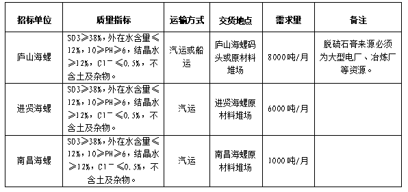 根據(jù)2021年11月-2022年4月脫硫石膏需求,進(jìn)賢、南昌、廬山海螺計(jì)劃進(jìn)行聯(lián)合招標(biāo),選定中標(biāo)人,為體現(xiàn)公平、公正、公開(kāi)的原則,拓寬采購(gòu)渠道,現(xiàn)將招標(biāo)相關(guān)事宜公告如下: