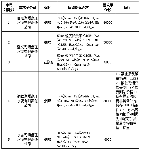 海螺水泥貴州區(qū)域擬對2021年10月21日至2021年11月20日生產(chǎn)用煤炭進行公開招標,選定中標單位,現(xiàn)將相關招標事宜公示如下: