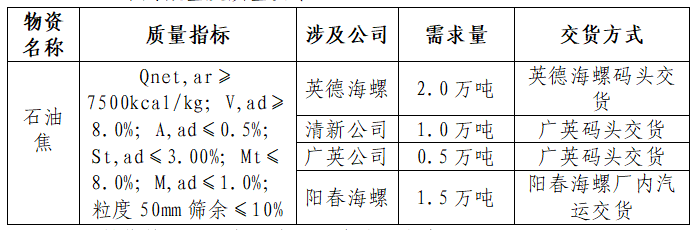 根據(jù)公司需求,擬對(duì)英德海螺、清新、廣英、陽(yáng)春公司所需石油焦進(jìn)行招標(biāo),為進(jìn)一步體現(xiàn)公平、公正、公開(kāi)的原則,現(xiàn)將招標(biāo)采購(gòu)信息發(fā)布如下: