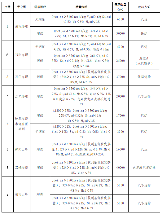 根據(jù)2021年11月21日-2021年12月20日海螺水泥湖南區(qū)域各子公司煤炭需求,現(xiàn)擬對(duì)煤炭進(jìn)行公開招標(biāo),選定中標(biāo)人,為體現(xiàn)公平、公正、公開的原則,拓寬采購(gòu)渠道,現(xiàn)將招標(biāo)相關(guān)事宜公告如下: