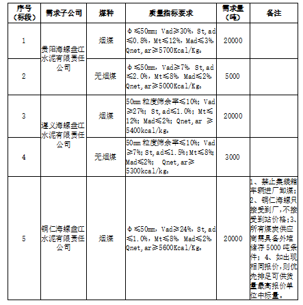 海螺水泥貴州區(qū)域擬對2021年11月21日至2021年12月20日生產(chǎn)用煤炭進(jìn)行公開招標(biāo),選定中標(biāo)單位,現(xiàn)將相關(guān)招標(biāo)事宜公示如下: