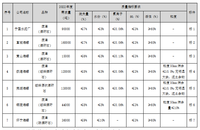 根據(jù)2022年度安徽海螺水泥股份有限公司寧國水泥廠(以下簡稱:寧國水泥廠)、安徽宣城海螺水泥有限公司(以下簡稱:宣城海螺)、黃山海螺水泥有限責任公司(以下簡稱;黃山海螺)、安徽銅陵海螺水泥有限公司(以下簡稱:銅陵海螺)、安徽荻港海螺水泥股份有限公司(以下簡稱:荻港海螺)、蕪湖海螺水泥有限公司(以下簡稱:蕪湖海螺)、安徽懷寧海螺水泥有限公司(以下簡稱:懷寧海螺)生產(chǎn)需求,對水泥生產(chǎn)配料用煤矸石采購進行聯(lián)合公開招標,為體現(xiàn)公平、公正、公開的原則,同時為拓寬采購渠道,提高采購質(zhì)量,現(xiàn)將招標相關事宜公告如下: