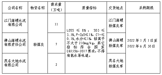 安徽海螺水泥股份有限公司廣東區(qū)域下屬的佛山、江門(mén)海螺、茂名大地三家公司擬對(duì)粉煤灰采購(gòu)進(jìn)行聯(lián)合公開(kāi)招標(biāo),為進(jìn)一步體現(xiàn)公平、公正、公開(kāi)的原則,拓寬采購(gòu)渠道,提高采購(gòu)質(zhì)量,現(xiàn)將相關(guān)事宜公告如下: