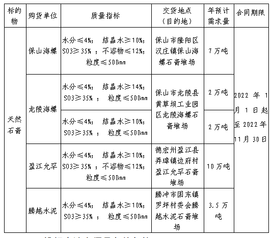 云南區(qū)域云西片區(qū)海螺公司擬對2022年度天然石膏進(jìn)行招標(biāo)采購,選定中標(biāo)人。本次招標(biāo)由云南區(qū)域保山海螺水泥有限責(zé)任公司負(fù)責(zé)組織實(shí)施。為體現(xiàn)公平、公正、公開的原則,拓寬采購渠道,通過網(wǎng)上海螺物資陽光采購平臺(網(wǎng)址http://ygcg.conch.cn)進(jìn)行公開招標(biāo),現(xiàn)將相關(guān)事宜公示如下: