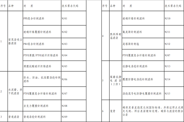 1.3使用壽命要求:窯尾耐高溫濾袋要求國產(chǎn)濾料不低于3年,進口濾料不低于5年(要求提供保證措施),煤磨濾袋不低于2年,普通濾袋、熟料庫耐溫袋不低于1年,水泥磨濾袋不低于1.5年,投標方在投標時必須列明具體保證壽命。