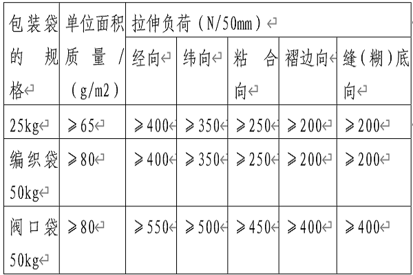 a.其中復膜袋單位面積質(zhì)量≥80 g/m2,含復膜質(zhì)量且復膜質(zhì)量應(yīng)不小于6g/m2,閥口袋含復膜質(zhì)量且復膜質(zhì)量應(yīng)不小于18g/m2