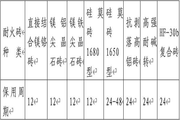 3、性能保證:在需方正常操作情況下,窯運轉(zhuǎn)率≥70%,各種耐火磚最低保證使用周期情況如下: 單位:月