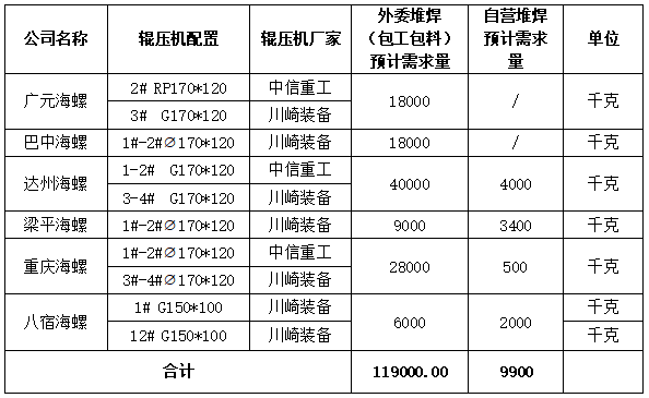2.標(biāo)的數(shù)量:輥面堆焊焊絲(包工包料)年預(yù)計(jì)需求119噸;耐磨焊絲年預(yù)計(jì)需求9.9噸;預(yù)計(jì)采購總額約813.10萬元,實(shí)際以各公司最終需求數(shù)量為準(zhǔn)。