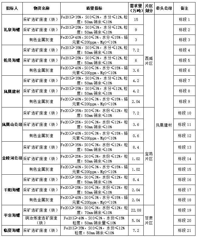 根據(jù)2022年度禮泉海螺、平?jīng)龊B?、千?yáng)海螺、乾縣海螺、臨夏海螺、鳳凰建材、金陵河公司、鳳凰山公司等8家公司生產(chǎn)經(jīng)營(yíng)計(jì)劃,現(xiàn)對(duì)2022年度鐵質(zhì)材料(直供)采購(gòu)組織招標(biāo),為進(jìn)一步體現(xiàn)公平、公正、公開(kāi)透明的原則,此次招標(biāo)將在安徽海螺水泥股份有限公司陽(yáng)光采購(gòu)平臺(tái)公開(kāi)進(jìn)行,現(xiàn)將招標(biāo)采購(gòu)信息發(fā)布如下: