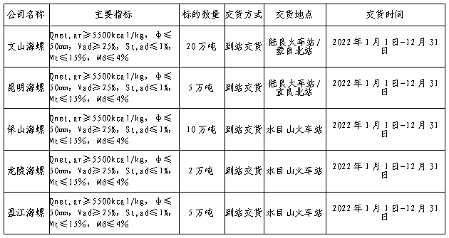 根據2022年區(qū)域內五公司煤炭需求,為保障各公司生產,文山海螺水泥有限責任公司擬對2022年直供煤炭采購進行公開招標,為體現公平、公正、公開的原則,同時為拓寬采購渠道,降低采購成本,現將招標相關事宜公告如下: