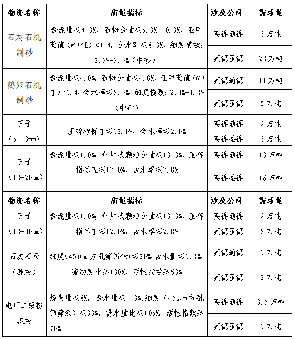根據(jù)生產(chǎn)用料需求,擬對英德通德、英德圣德攪拌站2022年度機制砂、石子、石灰石粉(磨灰)和電廠二級粉煤灰進(jìn)行招標(biāo),為進(jìn)一步體現(xiàn)公平、公正、公開的原則,現(xiàn)將招標(biāo)采購信息發(fā)布如下: