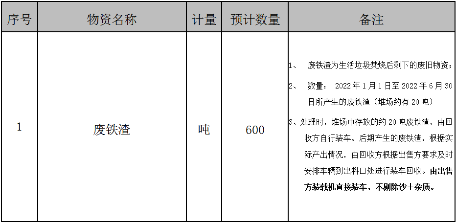 2.廢鐵渣為生活垃圾焚燒系統(tǒng)焚燒后的廢舊物資,從中標(biāo)日起截止2022年6月30日期間垃圾焚燒所產(chǎn)生的廢鐵渣,均由中標(biāo)單位根據(jù)招標(biāo)方要求分批次進(jìn)行回收,不做現(xiàn)場(chǎng)篩選,直接裝車過(guò)磅,所產(chǎn)生的一切費(fèi)用包含在投標(biāo)報(bào)價(jià)內(nèi)。
