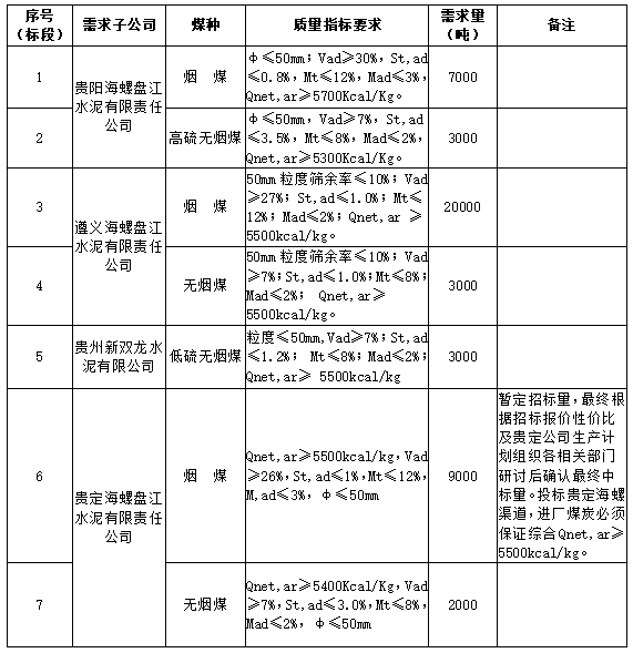海螺水泥貴州區(qū)域擬對2022年1月21日至2022年2月20日生產用煤炭進行公開招標,選定中標單位,現(xiàn)將相關招標事宜公示如下: