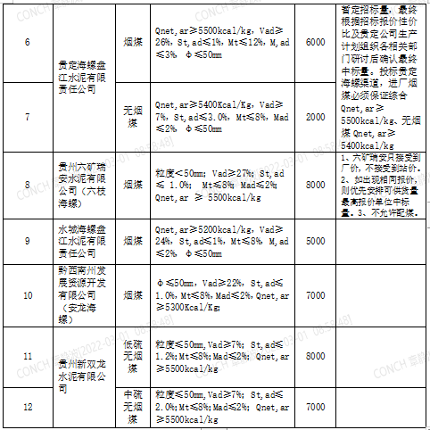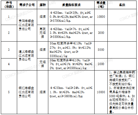 海螺水泥貴州區(qū)域擬對(duì)2022年3月21日至2022年4月20日生產(chǎn)用煤炭進(jìn)行公開(kāi)招標(biāo),選定中標(biāo)單位,現(xiàn)將相關(guān)招標(biāo)事宜公示如下:
