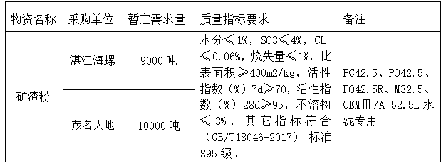 按照廣東區(qū)域供應(yīng)專業(yè)組2022年招標(biāo)計(jì)劃安排,安徽海螺水泥股份有限公司廣東區(qū)域下屬的湛江海螺、茂名大地公司2022年2季度礦渣粉聯(lián)合公開(kāi)招標(biāo)因首次公示不足三家,按招標(biāo)方案現(xiàn)進(jìn)行二次招標(biāo)公示,為進(jìn)一步體現(xiàn)公平、公正、公開(kāi)的原則,拓寬采購(gòu)渠道,提高采購(gòu)質(zhì)量,現(xiàn)將相關(guān)事宜公告如下: