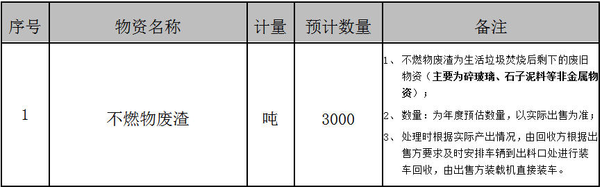 2. 不燃物廢渣為生活垃圾焚燒系統(tǒng)焚燒后的廢舊物資,從中標(biāo)日起截止2023年4月14日期間垃圾焚燒所產(chǎn)生的不燃物廢渣,均由中標(biāo)單位根據(jù)招標(biāo)方要求分批次進(jìn)行回收,現(xiàn)場直接裝車過磅,所產(chǎn)生的一切費(fèi)用包含在投標(biāo)報價內(nèi)。