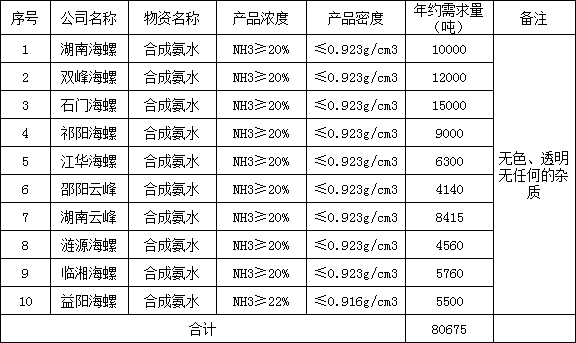 1、標(biāo)的內(nèi)容:合成氨水NH3≥20%、密度≤ 0.923g/cm3(其中益陽海螺合成氨水NH3≥22%、、密度≤ 0.916g/cm3),產(chǎn)品質(zhì)量應(yīng)符合國(guó)家工業(yè)氨水標(biāo)準(zhǔn)HG1-88-81《氨水》;