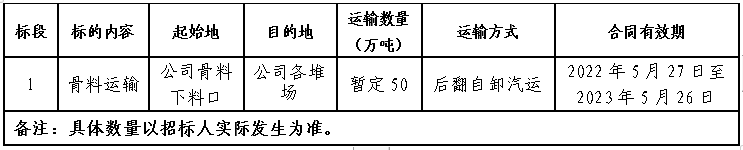 (二)2022年5月18日9:00至2022年5月21日9:00在禮泉海螺物資陽光采購平臺(tái)發(fā)布骨料運(yùn)輸招標(biāo)公告,同步在禮泉海螺公司大門、開票大廳、直供電廠及礦點(diǎn)等發(fā)布招標(biāo)公告,同時(shí)在當(dāng)?shù)刂饕獔?bào)社進(jìn)行公告,并接受報(bào)名;
