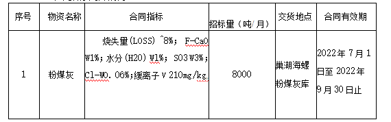 根據(jù)我公司生產(chǎn)需求,本著“公開、公平、公正”的原則, 擬對2022年三季度粉煤灰需求粉煤灰進行公開招標,為進一步 體現(xiàn)公開、公平、公正的原則,歡迎具備條件的單位參加,現(xiàn)將 招標相關事宜公告如下:
