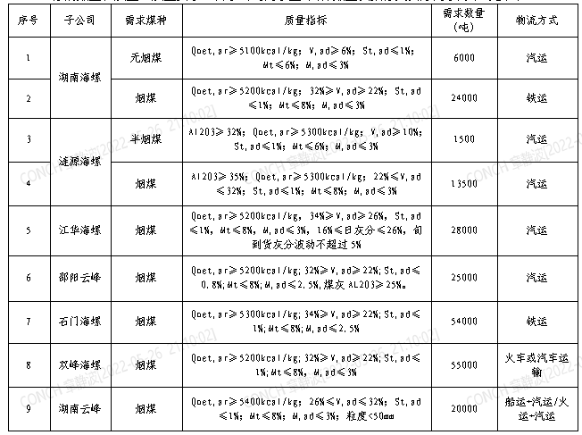 根據(jù)2022年6月21日-2022年7月20日海螺水泥湖南區(qū)域各子公司煤炭需求,現(xiàn)擬對煤炭進(jìn)行公開招標(biāo),選定中標(biāo)人,為體現(xiàn)公平、公正、公開的原則,拓寬采購渠道,現(xiàn)將招標(biāo)相關(guān)事宜公告如下: