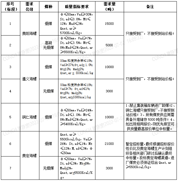 海螺水泥貴州區(qū)域擬對(duì)2022年7月21日至2022年8月20日生產(chǎn)用煤炭進(jìn)行公開招標(biāo),選定中標(biāo)單位,現(xiàn)將相關(guān)招標(biāo)事宜公示如下:
