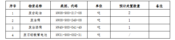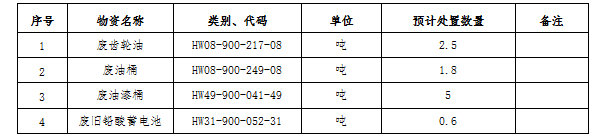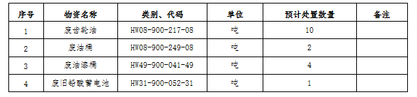 (一)標(biāo)的內(nèi)容及處置數(shù)量:廢礦物油、廢油桶、廢油漆桶、廢鉛酸蓄電池等危廢材料。處置數(shù)量以區(qū)域內(nèi)5家公司(南通海螺、海門(mén)海螺、太倉(cāng)海螺、海螺明珠、張家港海螺)實(shí)際過(guò)磅為準(zhǔn)。