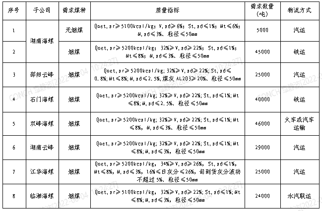 根據(jù)2022年8月21日-2022年9月20日海螺水泥湖南區(qū)域各子公司煤炭需求,現(xiàn)擬對(duì)煤炭進(jìn)行公開招標(biāo),選定中標(biāo)人,為體現(xiàn)公平、公正、公開的原則,拓寬采購(gòu)渠道,現(xiàn)將招標(biāo)相關(guān)事宜公告如下: