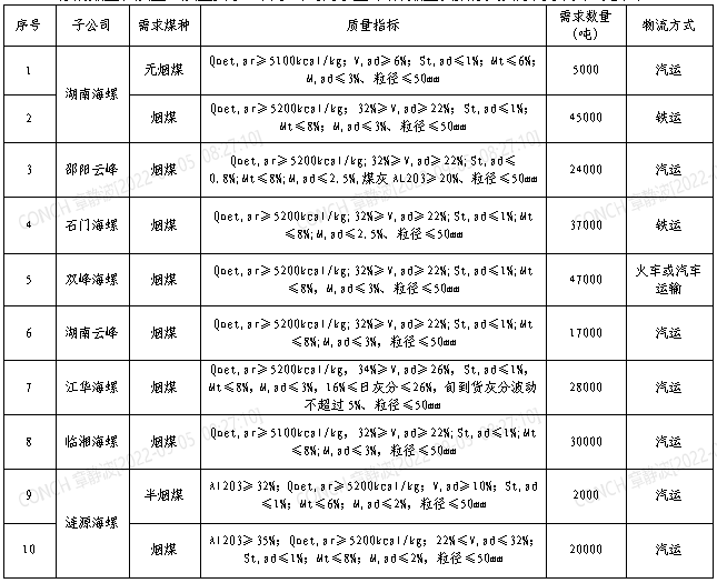 根據2022年9月21日-2022年10月20日海螺水泥湖南區(qū)域各子公司煤炭需求,現(xiàn)擬對煤炭進行公開招標,選定中標人,為體現(xiàn)公平、公正、公開的原則,拓寬采購渠道,現(xiàn)將招標相關事宜公告如下: