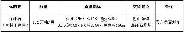根據(jù)巴中海螺生產(chǎn)經(jīng)營需求,現(xiàn)對(duì)生料用煤矸石采購業(yè)務(wù)進(jìn)行公開招標(biāo),為體現(xiàn)公平、公正、公開、透明的原則,現(xiàn)將招標(biāo)相關(guān)事宜公告如下: