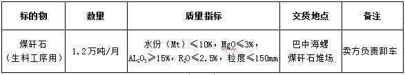 根據(jù)巴中海螺生產(chǎn)經(jīng)營需求,現(xiàn)對(duì)生料用煤矸石采購業(yè)務(wù)進(jìn)行公開招標(biāo),為體現(xiàn)公平、公正、公開、透明的原則,現(xiàn)將招標(biāo)相關(guān)事宜公告如下: