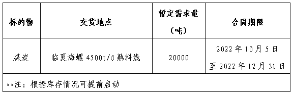 為做好我公司2022年煤炭采購工作,滿足生產(chǎn)需要,本著“公開、公平、公正”的原則,擬對煤炭直供渠道供貨進行公開招標(biāo),現(xiàn)將招標(biāo)采購信息發(fā)布如下: