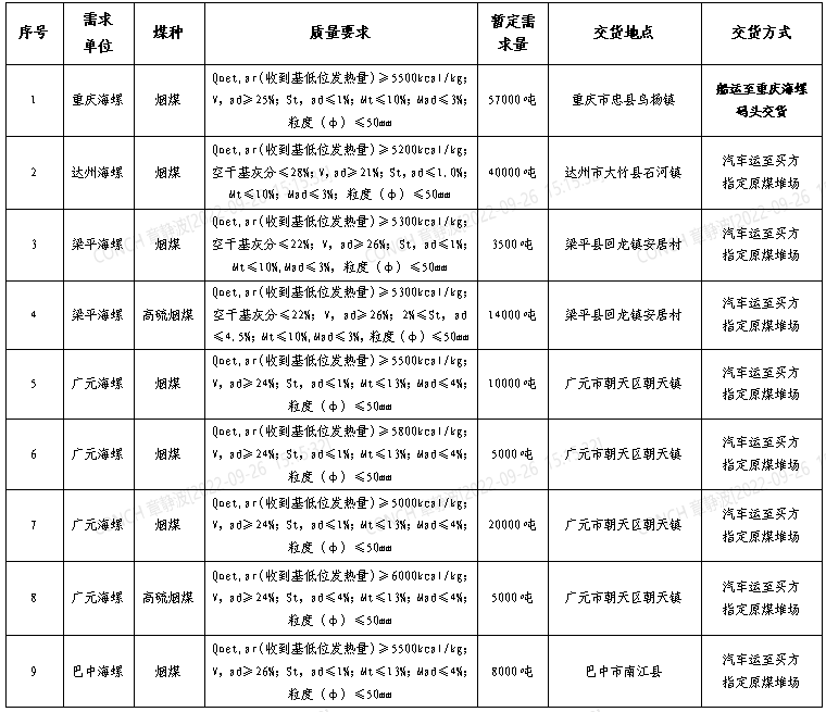2、投標人在報價時應綜合考慮煤炭生產(chǎn)、運輸過程中一切不確定因素,合理報價,此次招標中標價格為2022年10月份(2022年10月11日-2022年11月10日)供貨價格。簽訂買賣合同后,合同價格原則上在合同期內(nèi)固定不變,合同期內(nèi)交貨數(shù)量必須按買方要求均衡組織,不得單一集中某一時間段集中到達。
