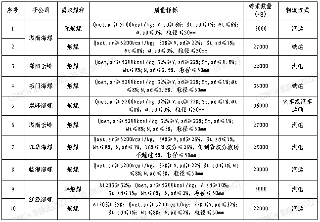 2.各投標(biāo)單位原則上需具備從2022年10月21日起供貨的能力,其中考慮邵陽云峰煤炭庫容較小,日供邵陽云峰煤炭量原則上需具備在1000噸以上;